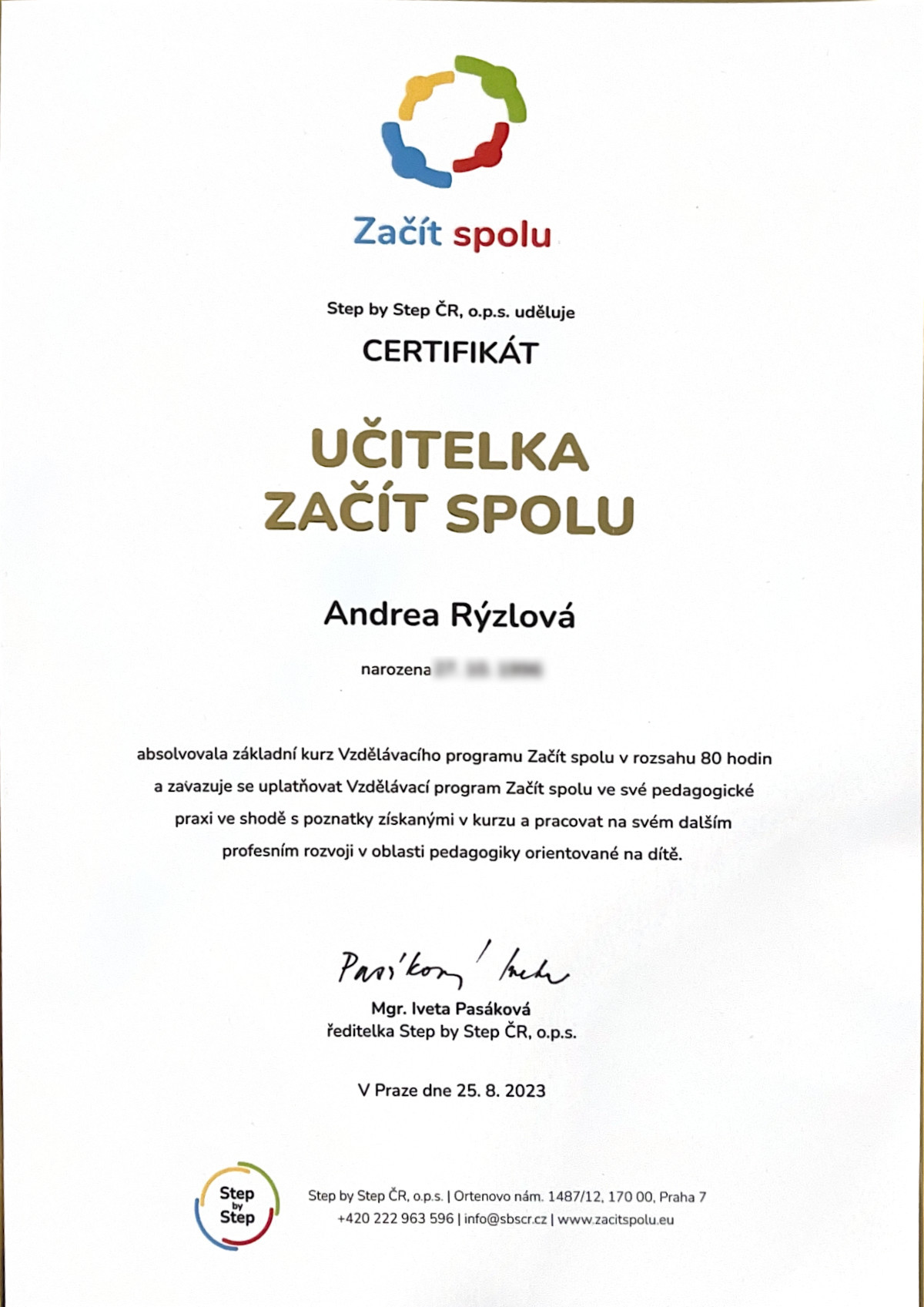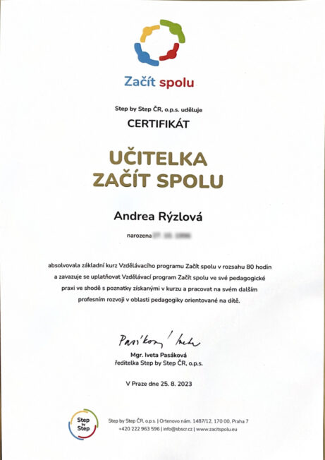 Své vzdělání jsem získala na Střední pedagogické škole v Berouně, kde jsem studovala obor Učitelství pro mateřské školy. Ve studiu jsem pokračovala na Západočeské univerzitě v Plzni, kde jsem na Pedagogické fakultě dokončila také obor Učitelství pro mateřské školy. Poté jsem nastoupila do státní mateřské školy v Plzni, kde jsem pracovala jako učitelka. Právě tam jsem se setkala s programem Začít spolu, který se stal pro mou práci klíčovým. Tento program mě oslovil svým důrazem na partnerský přístup k dětem a na podporu jejich samostatnosti a tvořivosti. Absolvovala jsem také letní školu zaměřenou na tento program.