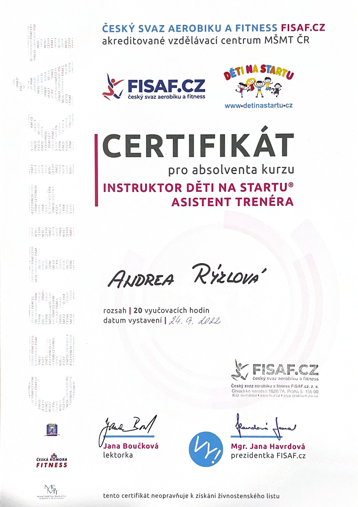 Vystudovala jsem sportovní gymnázium a následně Vyšší odbornou školu, obor předškolní a mimoškolní pedagogika. Sport a pohyb jsou mou celoživotní součástí. Jsem bývalá reprezentantka ve sportovní střelbě a dnes se sportu věnuji hlavně rekreačně. Nejvíce mě baví fitness, běh a pobyt v přírodě, které mi dodávají energii i inspiraci pro práci s dětmi. Věřím, že právě pohyb a zdravý životní styl mohou být pro děti cestou k radosti, sebevědomí a dobré náladě.